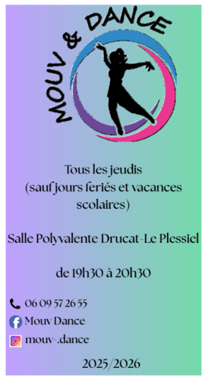 | Mouv & Danse propose des activités de Zumba & kuduro Tous les jeudis de 19h30 à 20h30 à la Salle Jean François Le Sueur. Retrouvez toutes leurs activités en cliquant ici. Contact: Mme GUILLOT Evelyne, 06.09.57.26.55